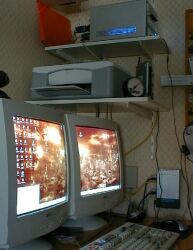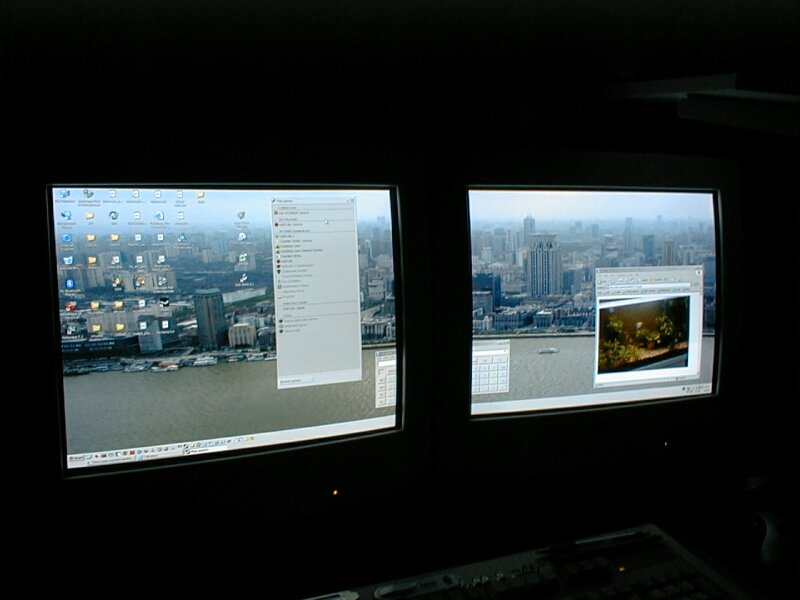 Dubbla skärmar i drift för första gången efter installation av nytt grafikkort (GeForce 6600GT). Även ett test att fota bildskärm i mörker. |