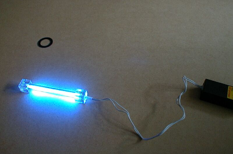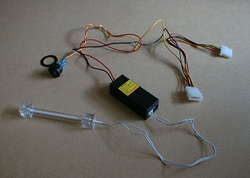 Nu med ett 10cm blått "cold cathode" rör monterat. Fint med blå glöd i burken som matchar dioden i fronten som visar att datorn är påslagen. (snacka om "dekaltrimmad") Bilder på lysröret: Hela kit:et. Ström på och röret glöder. (lyckades misshandla bilderna lite, men nu är originalen raderade ur kameran så det får vänta tills jag tar nya) |