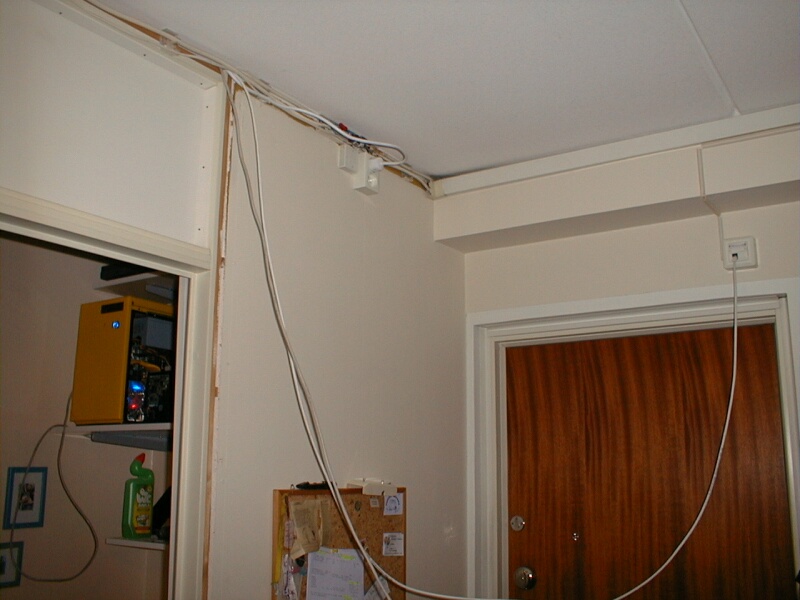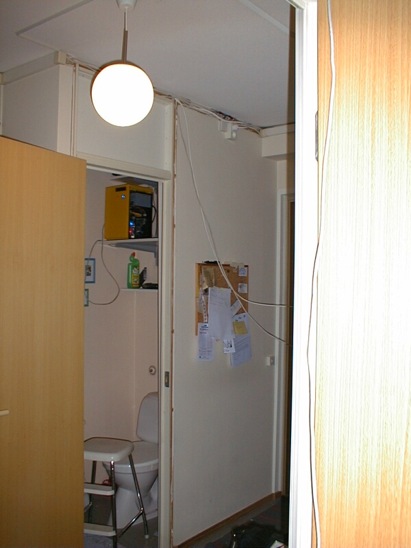 Flytta ut servarna till eget rum (toaletten!) -030919- Allting inkopplat och fungerar. Bara att gömma kablarna. Det får plats med router, två spelservrar (de på bild) och en filserver (desktop AT låda ska in senare). Dörrlisterna kvar...
