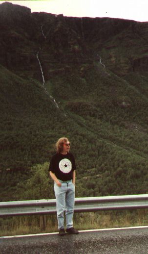 Nordkap. Här står Sylle framför ett antal mindre bäckar som rinner nedför